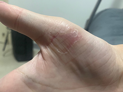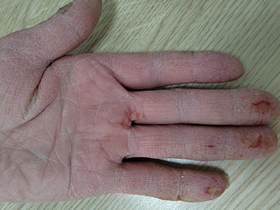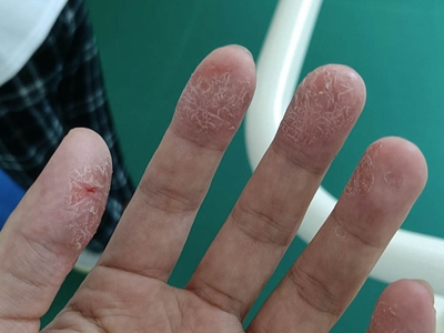 鳞屑角化型手癣患者手指皮肤干燥、脱屑,表面皮肤缺损、开裂,指腹正常纹理消失,由深浅不一的横纹代替,患者在摩擦手部皮肤后出现持续性疼痛。