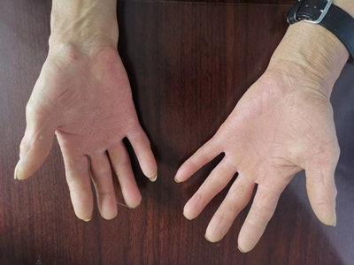鳞屑角化型手癣患者右手掌症状明显,表现为手掌皮肤明显增厚、粗糙,皮肤干燥、有紧绷感,纹路明显,伴有少量鳞屑,手掌中央角化明显,皮肤颜色变黑。