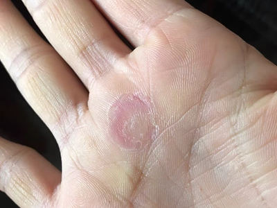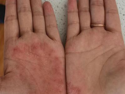 鳞屑角化型手癣导致患者手掌上出现一块红斑,形状不规则,边界清晰,与正常皮肤区分明显。且红斑处皮肤干燥、紧绷,上面附着少量白色鳞屑。