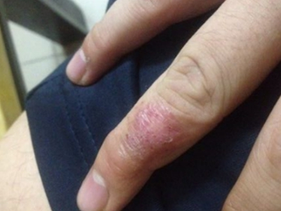 鳞屑角化型手癣患者手指指尖有明显皮损表现,局部充血发红,表面大面积起皮伴有白色脱屑,脱屑后露出正常皮肤,同时会伴随瘙痒、灼热等不适。