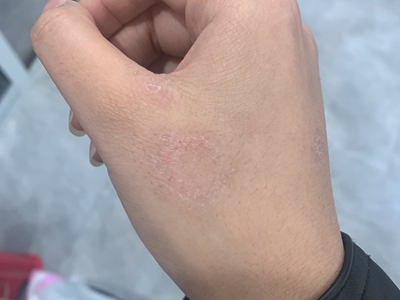 鳞屑角化型手癣患者的右侧手背出现大面积红斑,边缘颜色相对较重,略微凸起,与正常皮肤之间境界清晰,中间颜色较浅,不明显隆起。表面无糜烂、破损现象,若不及时治疗会出现脱屑、起皮现象。