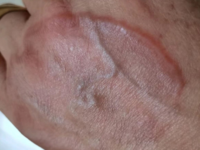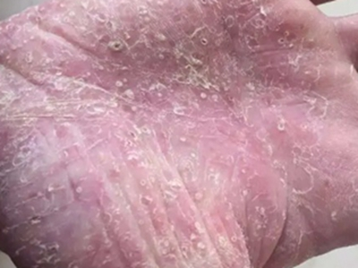 鳞屑角化型手癣见于右手手掌,皮损为弥漫性红斑,表面覆有大量白色鳞屑,部分已撕脱,多为局部水疱破溃、渗液,干燥后结痂所形成。同时患者还可伴有瘙痒感。