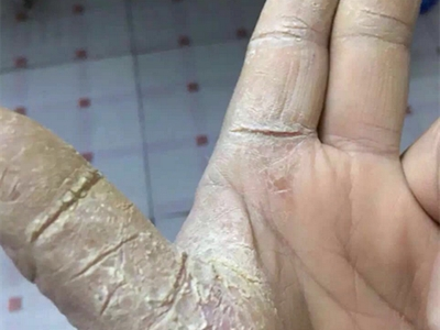 鳞屑角化型手癣患者手指部位的皮肤会出现明显的增厚,关节处增厚的皮肤会出现较深的裂口,靠近掌跟的部位裂口增多,会出现块状脱落,露出自身正常的皮肤。