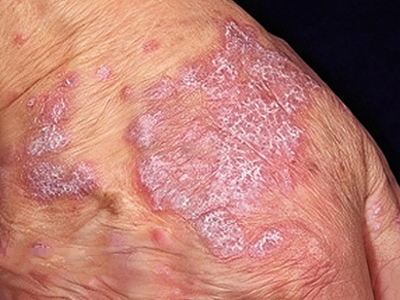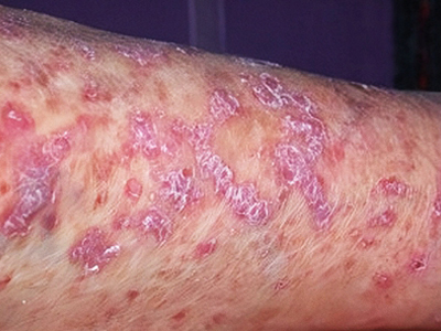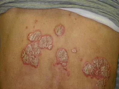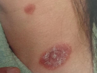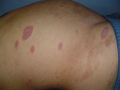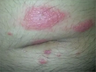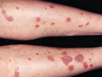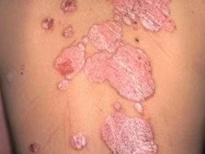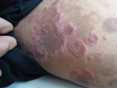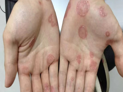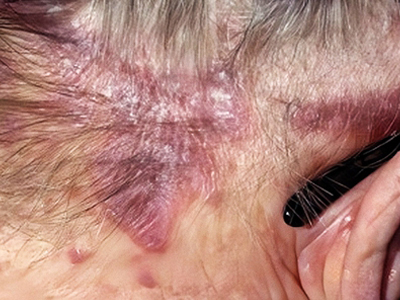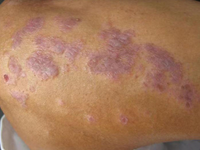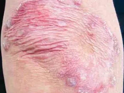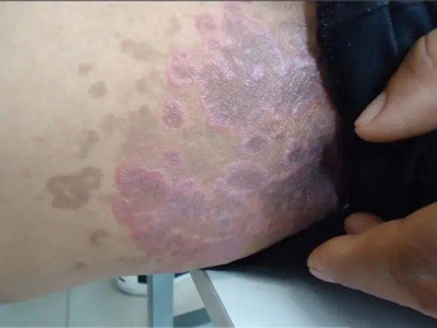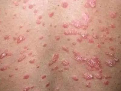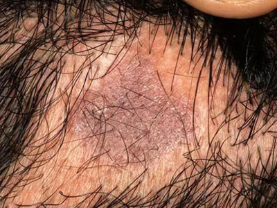 环状扁平苔藓发生在头皮部位,表现为患者后脑头皮处出现几块红斑,形状不规则,大小、形态也不一样,中间有毛发穿过,周围皮肤附有厚厚的鳞屑,其颜色发白。