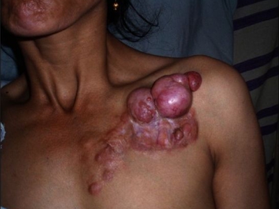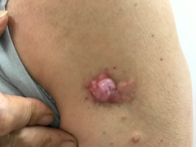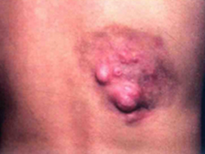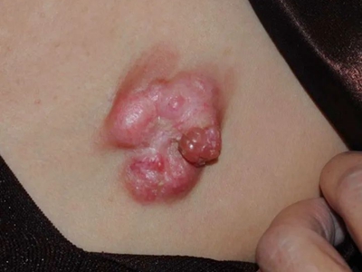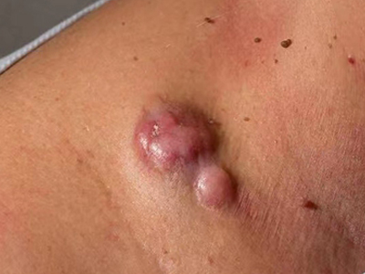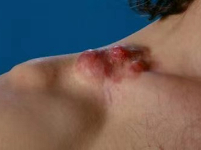 隆突性皮肤纤维肉瘤可以在肩膀上出现红色的小疙瘩,单发,质地比较坚硬,初起时是比较小的皮内结节,随后会逐渐增大或融合隆起。