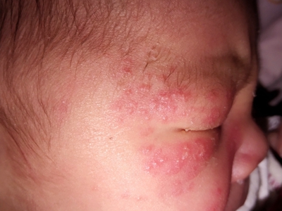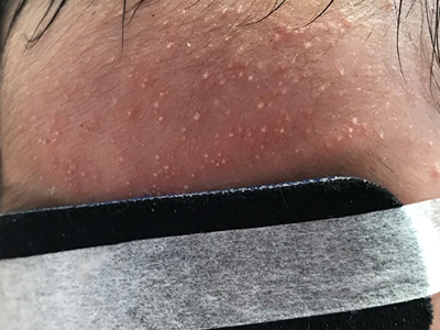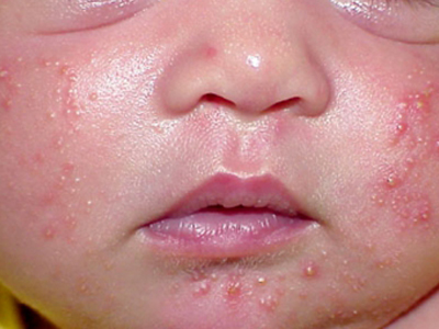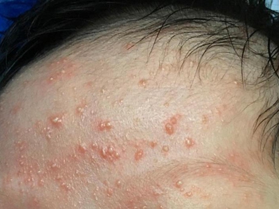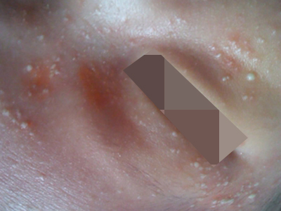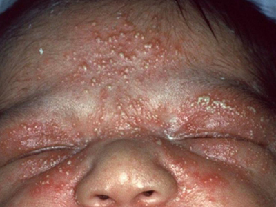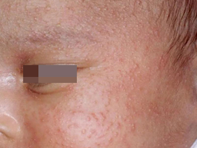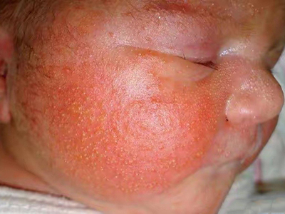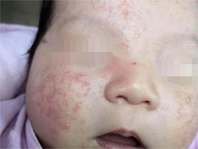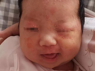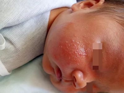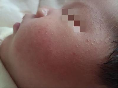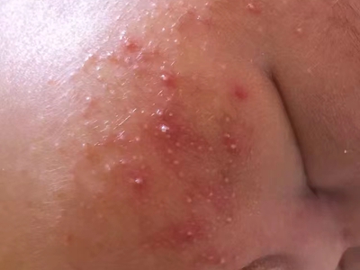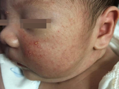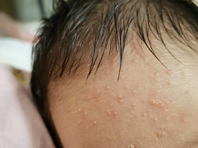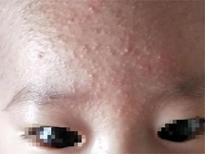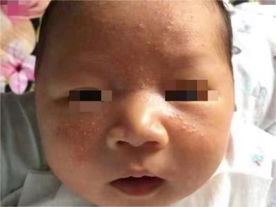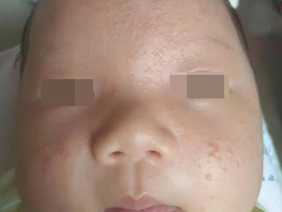 新生儿痤疮皮损发生在前额部位,初起主要为丘疹,然后逐渐演变成粉刺、脓疱,无特殊的分布形态,数周或数月内自愈,大多数无需治疗,注意护理即可。