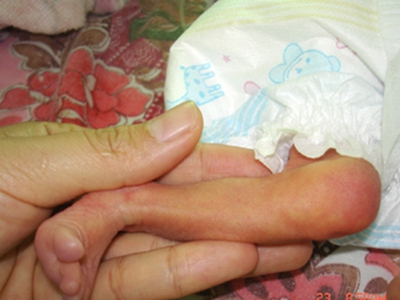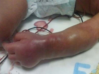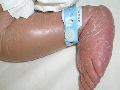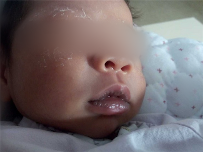 新生儿硬肿症发生于面部可见嘴唇皮肤呈现暗红色,面部有明显水肿,发紧发亮,按之有橡胶皮感。还伴有脱皮症状。
