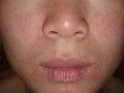 面部变应性接触性皮炎面部红斑上细小丘疹图