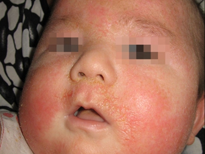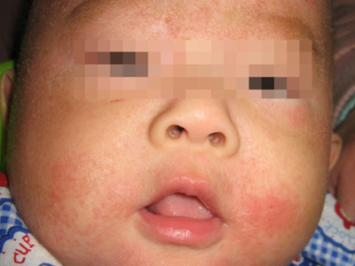 面部变应性接触性皮炎发生于婴儿整个面部,起病较急,表现为弥漫性红斑的基础上出现针尖至小米粒大小的密集丘疹,由于瘙痒,婴儿常哭闹、抓挠患处。