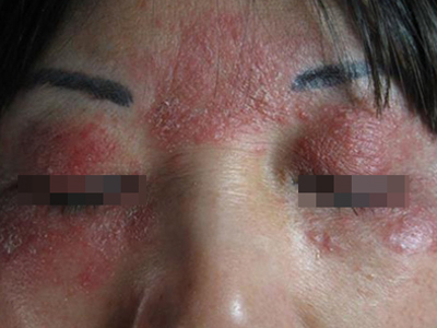 面部变应性接触性皮炎面部红色斑块伴脱屑图