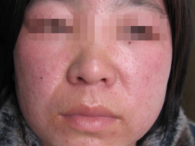 面部变应性接触性皮炎面部一大片深红色斑块图
