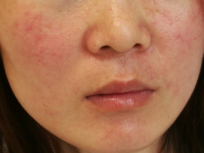 面部变应性接触性皮炎患者面部出现大片红斑,其上有针尖大的小丘疹出现,同时皮损部位皮肤出现轻度增生及苔藓样变,皮肤表面粗糙。