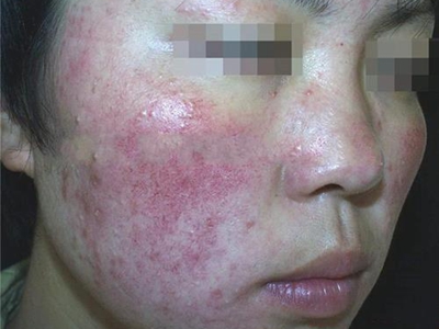 面部变应性接触性皮炎患者在接触化妆品等物质后,面部出现境界清楚的红斑,呈深红色或紫红色,其上可有丘疹、丘疱疹,亦可出现豆大的水疱,常自觉瘙痒。