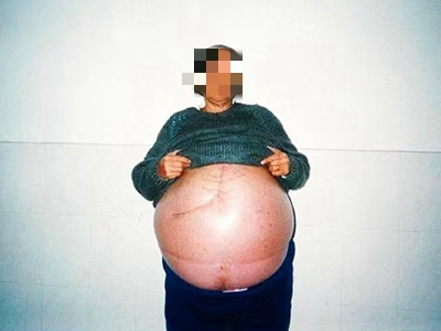 血吸虫病患者如果治疗不及时,会导致腹水进行性加重、肝脾肿大,临床表现为腹部异常增大,表皮紧张发亮,肚脐外翻,少量血管显露于体表。