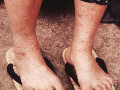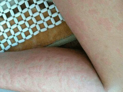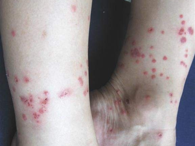血吸虫病患者腿部出现大量的粉红色风团,呈扁平隆起状,邻近的风团可融合成大片,伴有明显的瘙痒感,搔抓会导致皮损增多、变大。