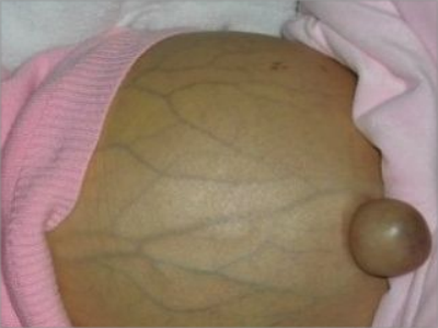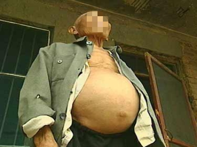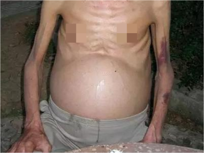 血吸虫病的典型症状之一为腹部膨隆,表现为肚子明显鼓起,能看到明显的血管走行,肚脐像球一样隆起,可伴有腹痛、发热等临床症状。