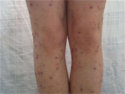 血吸虫病患者的小腿处出现暗红色丘疹样皮损,数量较多,遍布整个下肢,呈对称性分布,豌豆大小,圆形或不规则形,邻近皮损会发生融合。