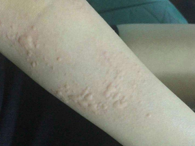 血吸虫病患者胳膊出现数量不等的皮色或苍白色风团,呈圆形、椭圆形、不规则形,看起来凹凸不平,患者同时还会出现发热、腹痛等临床表现。