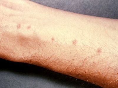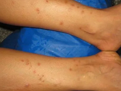 血吸虫病患者的小腿出现很多丘疹,隆起于皮肤,呈散在分布,相互不融合,颜色为淡红色,大部分丘疹有绿豆大小,通常3天左右可自行消退。