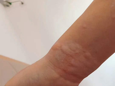 血吸虫病患者的手腕部位出现荨麻疹样皮损,表现为数量不等的椭圆形风团,看起来像扁平疙瘩,高出周围皮肤,颜色偏白,触摸感觉偏硬,周围皮肤轻微发红,发病3天左右可自行恢复。