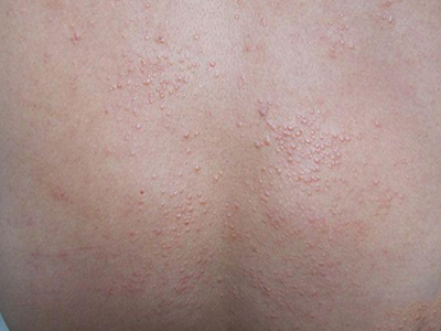 血吸虫病患者背部出现丘疹样皮损,表现为一个个的小圆疙瘩,密集成片,粟粒大小,触摸背部感觉粗糙不平,圆疙瘩的基底呈淡红色。