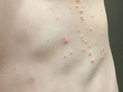 血吸虫病患者的肋部皮肤长出了一片小疙瘩,呈半球形,粉白色,这些疙瘩独立存在不融合,可与发热同时出现,是血吸虫寄生于人体所引起。