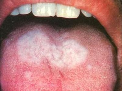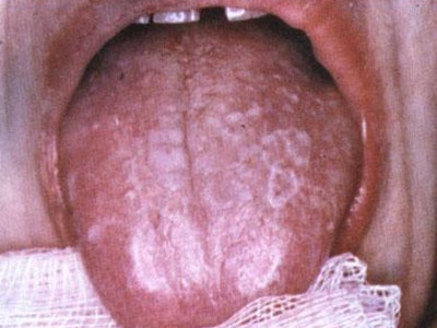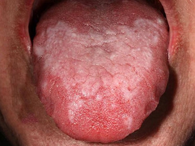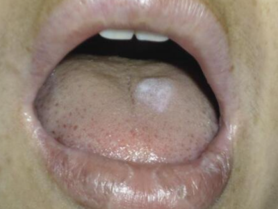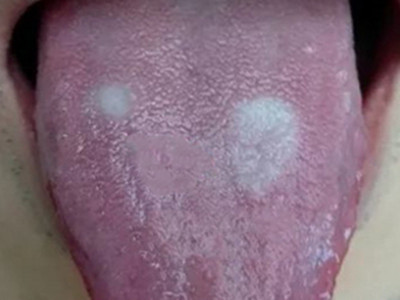 斑块型口腔扁平苔藓表面为患者舌头上出现白斑,形态不规则,边界清楚,整个舌面呈暗黄色,边缘有红色小颗粒样物,嘴唇干燥。其发病可能与精神因素、内分泌因素、免疫因素或感染因素等有关。