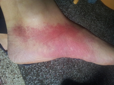 一氧化碳中毒表现为丹毒样红斑,发生于脚部时,呈不规则形,边界清晰,同时伴随头晕、头痛、恶心等症状。在脱离有毒环境后,症状可得到缓解。