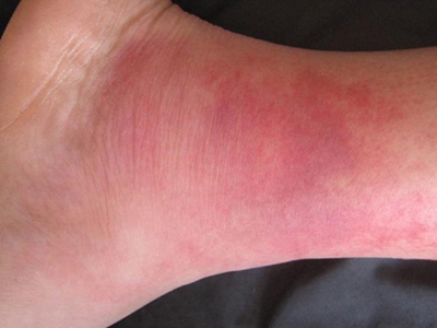 一氧化碳中毒后,脚腕处皮肤可出现边界不清的丹毒样红斑,融合成片状,形状不规则,呈暗红色,周围伴有红晕,略高出于皮肤,按压不褪色,愈后不留有瘢痕。