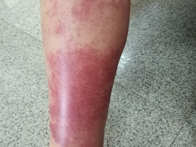 一氧化碳中毒患者小腿出现丹毒样红斑,同时伴有红肿,皮损面积较大,与正常皮肤界限清晰,压之不褪色,患者还会出现不同程度头晕、头痛等症状。