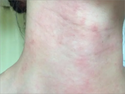 一氧化碳中毒患者前颈部位的皮肤发红,像是有一片片的红斑,之间互相连接、汇聚,同时会出现头晕、恶心等不适症状,需及时治疗避免影响生命健康。
