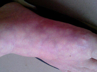 一氧化碳中毒表现为脚部水肿,伴随皮肤颜色发红、皮温升高,甚至皮肤紧张等情况,同时受累部位皮肤颜色深浅不一,形成网状纹路。