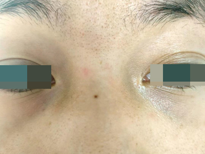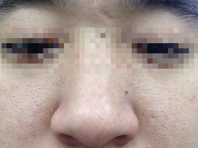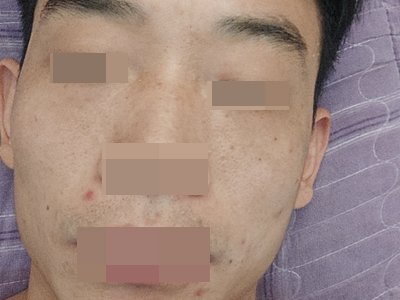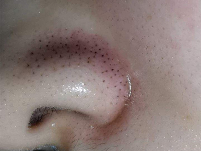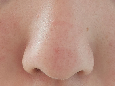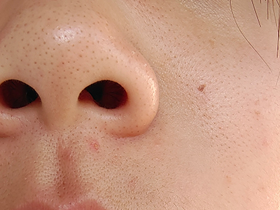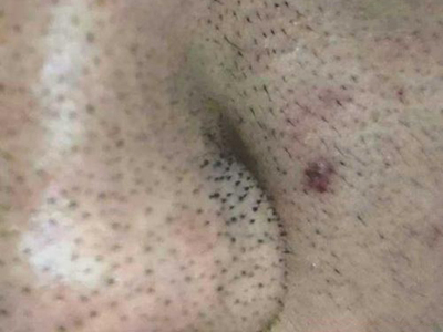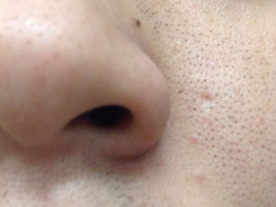 患者左侧鼻翼上有一片毛囊口上,出现针尖样稍凸起于周围皮肤的黑头粉刺,看上去像是有密密麻麻的小黑点,并且毛囊口还能看见类似毛发样东西长出,周围皮肤略红,属于痤疮早期症状。