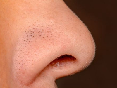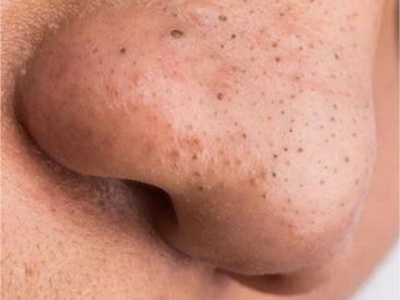 黑头患者鼻尖上的毛孔增大并且为浅褐色、黑色,部分毛孔顶部会稍凸起于皮表,而少部分毛孔中间呈凹陷状,导致触摸鼻尖时会感觉皮肤凹凸不平。