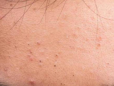 黑头在额头部位累及部分毛囊,表现为毛囊口有黑色小角栓,呈散在分布,属于痤疮早期表现,无疼痛、瘙痒等症状,部分患者的皮肤表面能触及隆起的圆形丘疹。