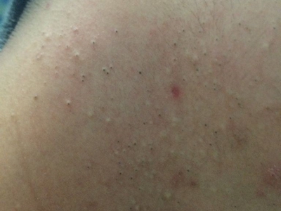 黑头患者脖子一侧的皮肤表面有中央为黑色的圆形隆起丘疹,如针尖大小,分布无明显规律,是由黑色小角堵塞在毛囊口导致,在临床上较少见。