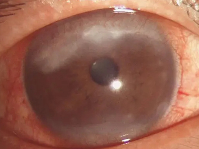 基质性角膜炎表现为黑眼球上有云雾状的灰白色斑块,整体雾蒙蒙的,混浊不清,周围有密集分布的红血丝向内浸润,并逐渐向内伸展。