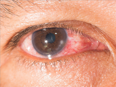 基质性角膜炎表现为白眼球发红,分布有密密麻麻的红色血丝,逐渐向内伸展,黑眼球边缘有一圈灰白色的云雾状斑块,患者有流泪、畏光等症状。