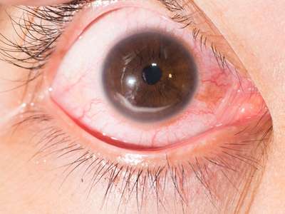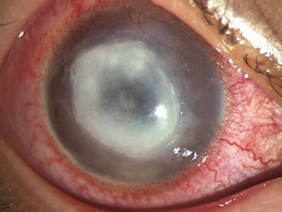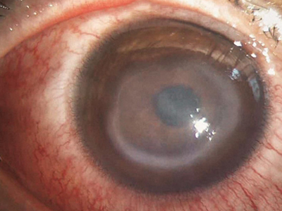 基质性角膜炎见患者黑眼球上出现一片白白的薄膜,整体较为混浊,同时周围伴有密密麻麻的红血丝,逐渐向内浸润,呈不规则形分布。