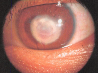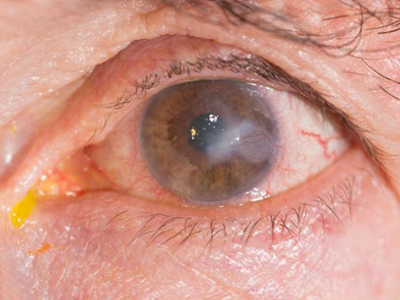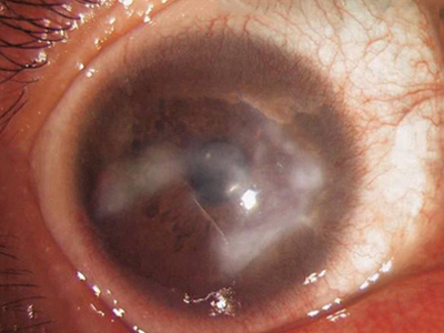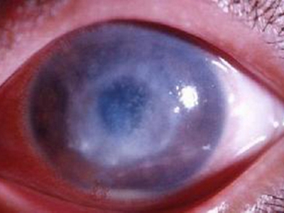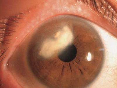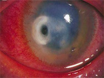 基质性角膜炎患者表现为角膜基质内混浊,角膜溶解坏死,表面出现类圆形灰白色脓肿病灶,以及一小部分缺损,病程缓慢,可反复发作。