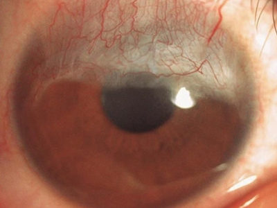 随着病情进展,角膜基质深层出现新生血管,在角膜板层间呈红色毛刷状,最终炎症扩展至角膜中央,角膜混浊、水肿。炎症消退后,水肿消失,少数患者遗留厚薄不等的瘢痕,萎缩的血管在基质内表现为灰白色纤细丝状物,称为幻影血管。