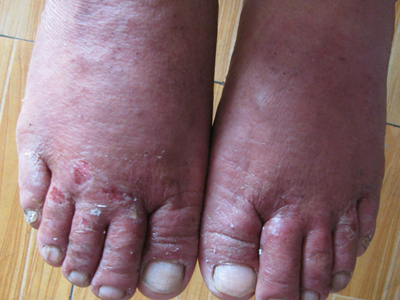 亚急性湿疹脚背大片红斑皮肤红肿图