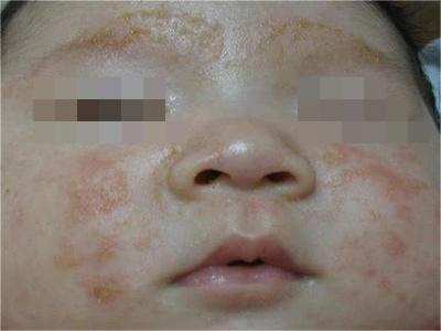 亚急性湿疹头面部皮肤潮红并有黄褐色结痂图