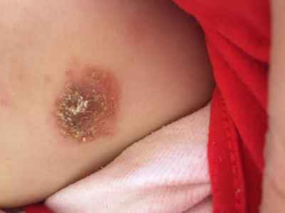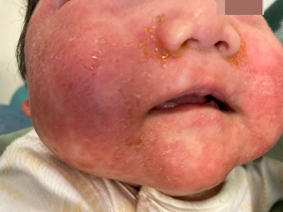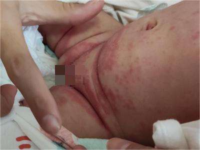 亚急性湿疹婴儿头面部大部分皮肤潮红,颜色分布不均,其上附有大小不等的黄褐色结痂,结痂边缘干燥发白翘起,症状蔓延至婴儿前胸,伴有瘙痒等不适。