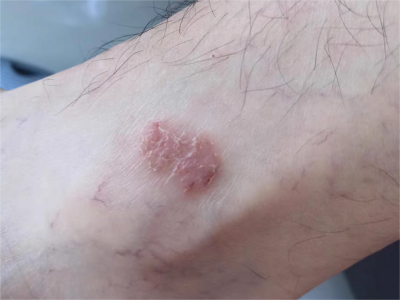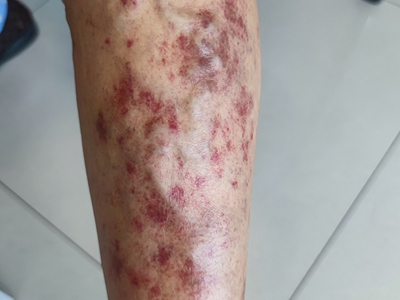 亚急性湿疹患者左侧脚背处有红色的结节,形状不规则,结节突出稍高于皮肤表面,皮损边缘清晰,表面紧实发亮,有部分表面有鲜红色血痂,周围皮肤有不同程度的色素沉着。