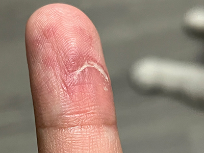 亚急性湿疹手部手指内侧顶端皮肤出现脱皮现象,脱皮后的皮肤呈红色,表面光滑有光泽,指纹消失,与正常肤色对比明显,脱皮边缘有白色翘起死皮。