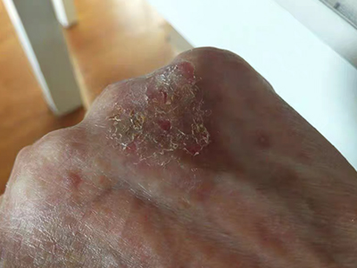 亚急性湿疹患者手背部位出现结痂表现,并带有明显的瘙痒,搔抓以后导致痂皮破裂,出现轻微的渗血表现,患者主诉皮损经常好了又犯。