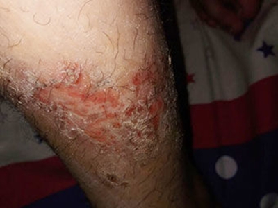亚急性湿疹症状较急性期减轻,表现为患者脚踝上面有个鹌鹑蛋大小的暗红色斑,边缘较清楚,上面有少量白色皮屑附着,瘙痒感仍明显,同时皮损边缘有搔抓或摩擦出现的点状红棕色糜烂面,此时应注意皮肤的卫生,避免搔抓。