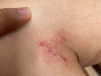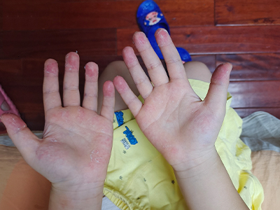 亚急性湿疹手掌靠近大拇指的侧面皮肤上有一块红斑,乒乓球大小,边界模糊,红班上有多个小米大小的疙瘩,聚集分布,部分有融合,伴有瘙痒症状。