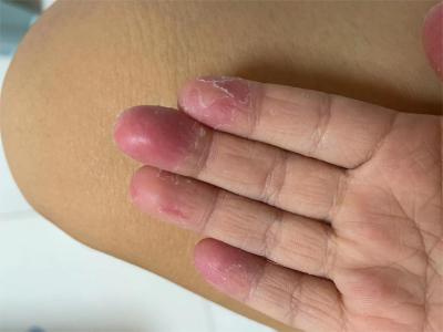 亚急性湿疹手部手指顶端脱皮发红图